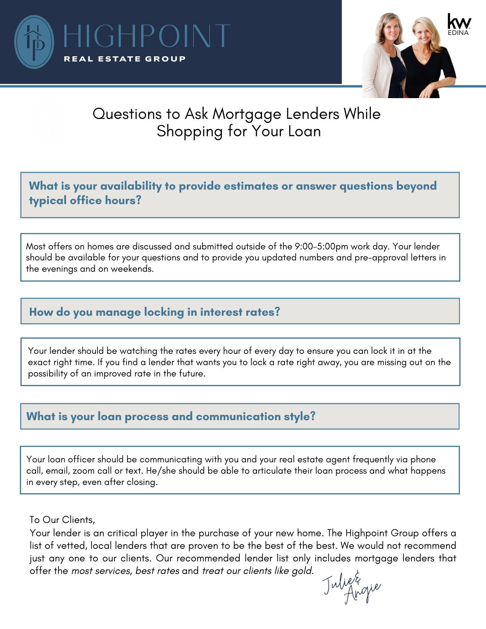 Julie and Angie work closely with all lenders to make sure we give our clients the best home buying experience. We are here to serve you with excellence. Our goal is to get our buyers to the closing table with